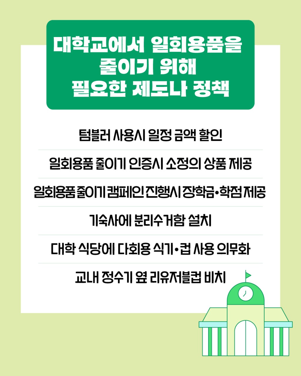 대학생들은 일상에서 주로 어떤 쓰레기를 배출하고 있는지, 쓰레기를 줄이기 위해 어떤 노력을 했는지, 그리고 자원순환이 되기 위해서는 어떤 제도가 필요하다고 느꼈는지 다양한 의견들을 정리해 보았습니다.