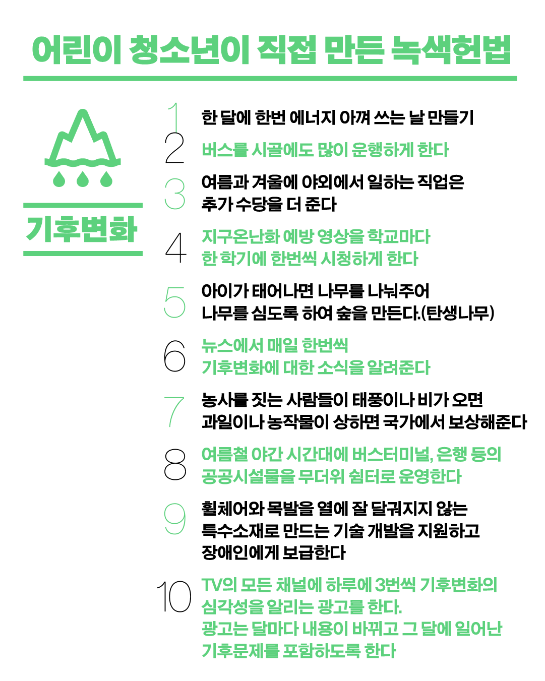 5월부터 11월까지 어린이 청소년이 직접 필요한 조항을 제안하고 투표를 하여 만든 녹색헌법 조항 결과가 나왔습니다.